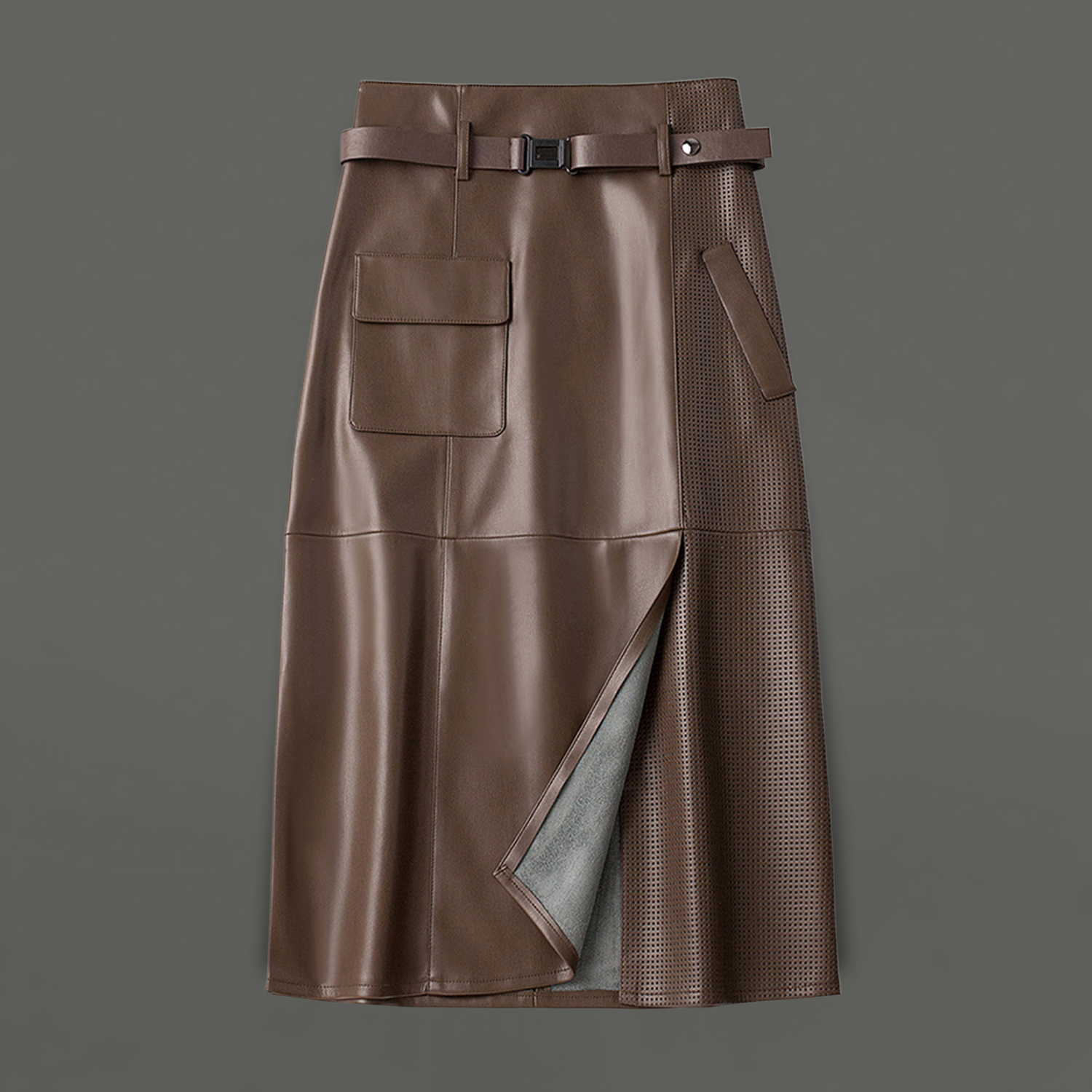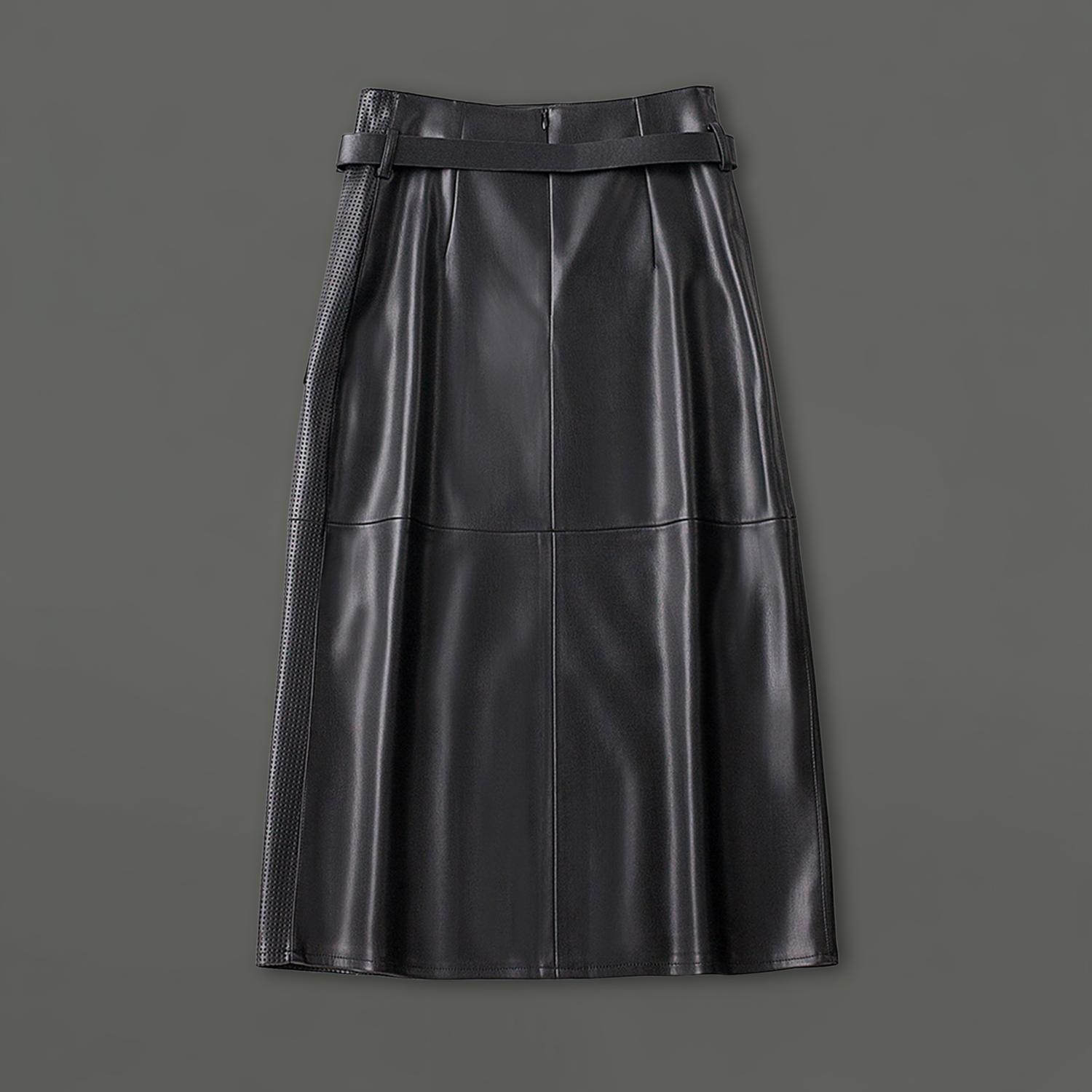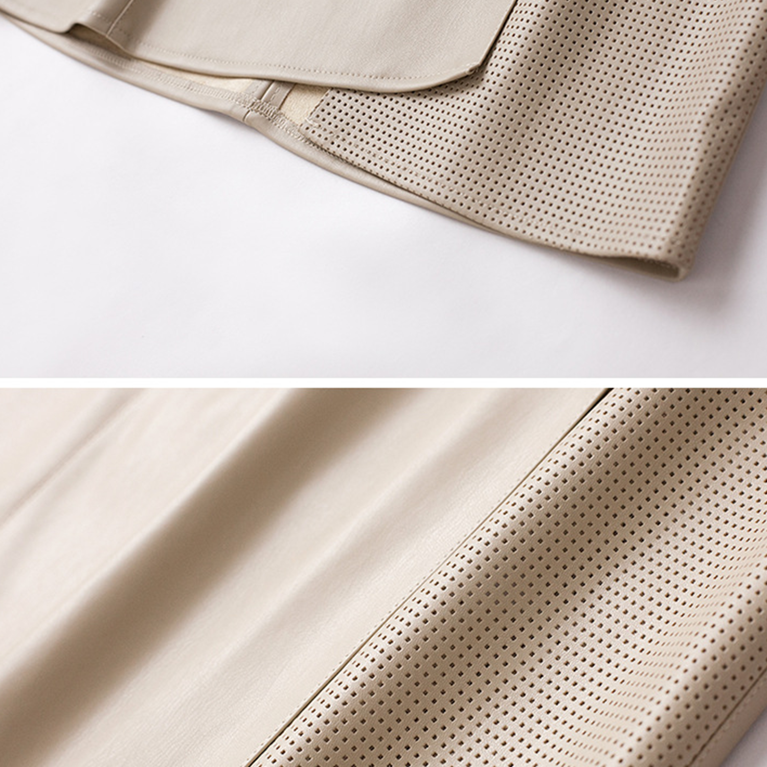 Crafted from supple sheepskin leather, this high-waisted skirt sculpts the form with quiet strength. Smooth and perforated textures interplay in motion, creating a silhouette that feels both architectural and instinctively feminine — modern leather, redefined.