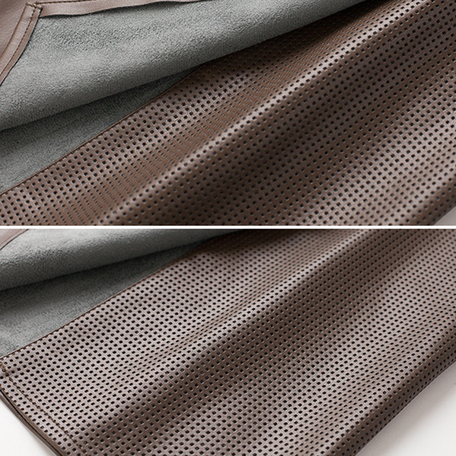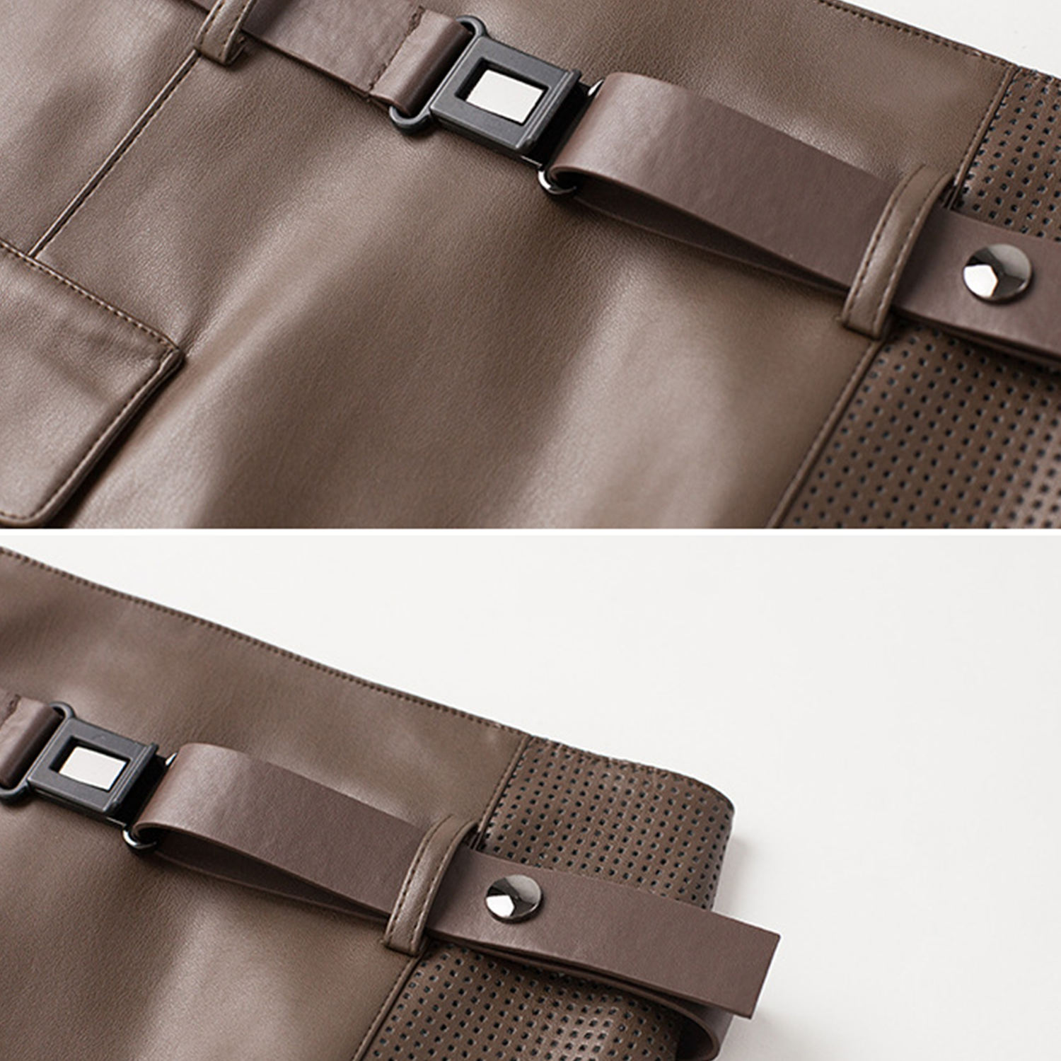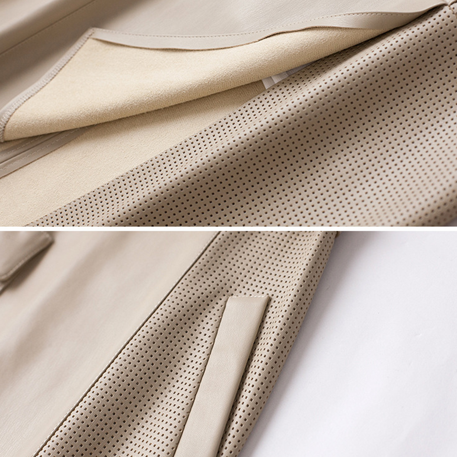 Crafted from supple sheepskin leather, this high-waisted skirt sculpts the form with quiet strength. Smooth and perforated textures interplay in motion, creating a silhouette that feels both architectural and instinctively feminine — modern leather, redefined.