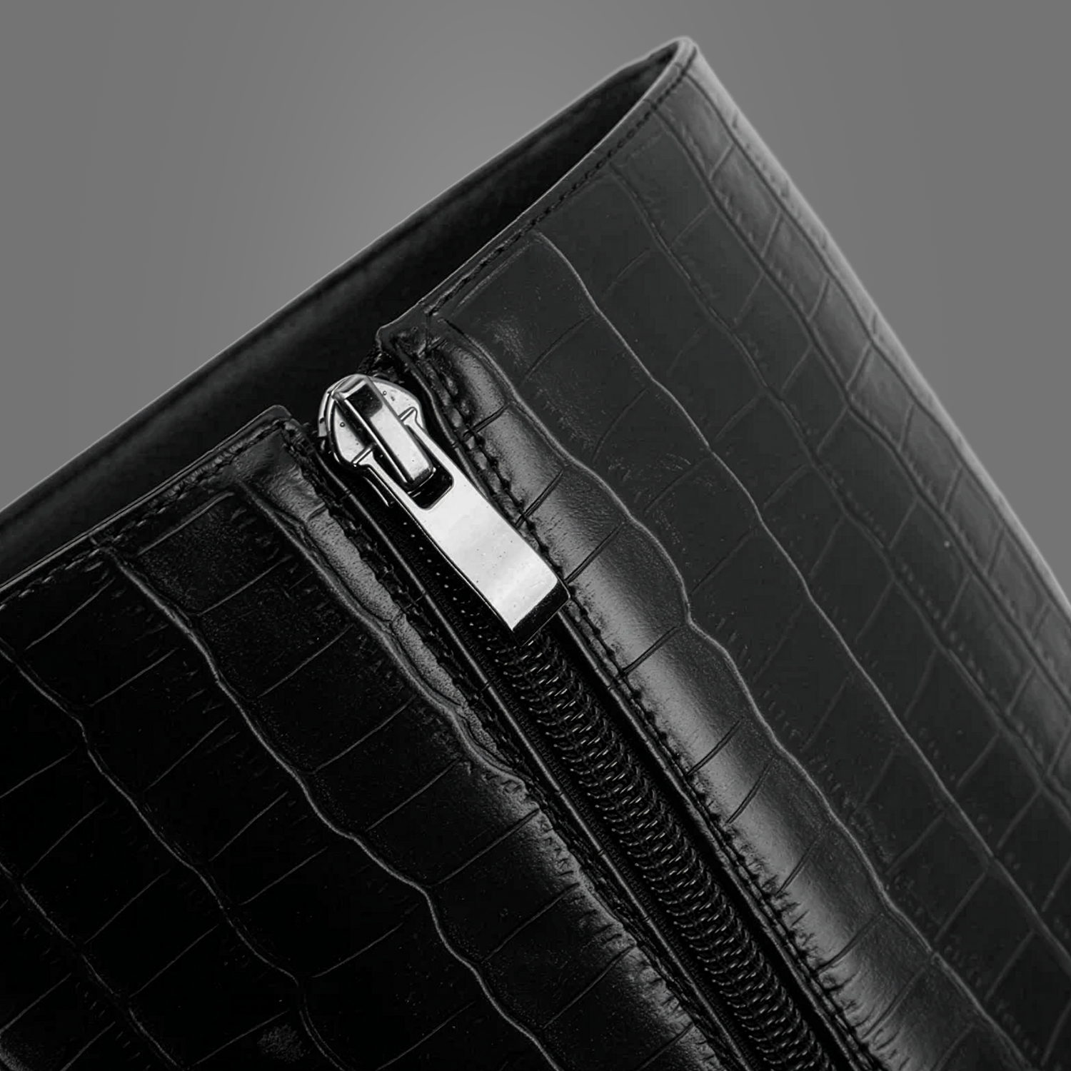 Crafted in a striking crocodile-embossed finish, the Cortessa Stiletto Heel Boots redefine power dressing with sculpted precision. Made from premium microfiber, the pointed-toe silhouette and sleek stiletto heel elongate the leg with effortless allure, while the cushioned leather insole ensures comfort that lasts well beyond the spotlight.