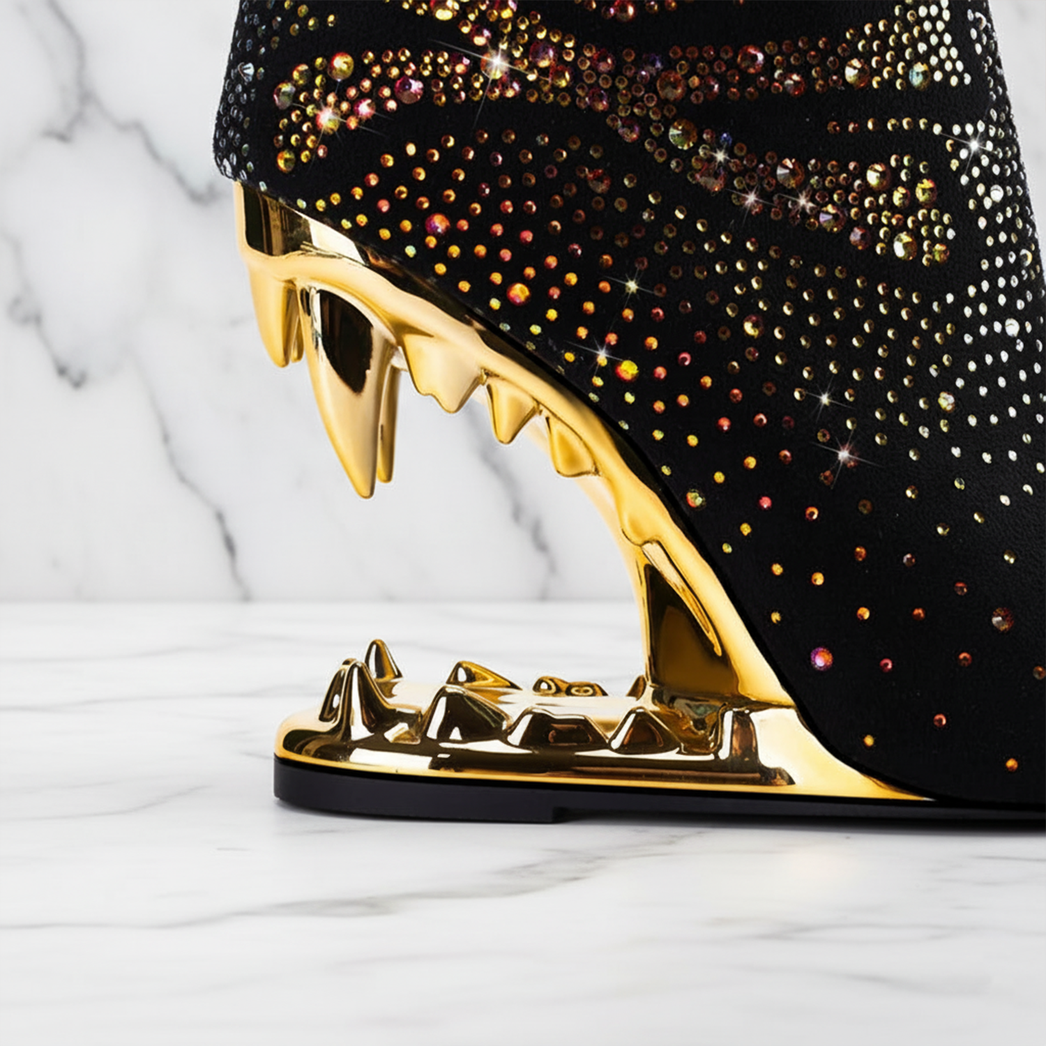 Make a statement that bites. These sculptural ankle boots feature a gleaming metallic fang heel, wrapped in soft black suede and adorned with a rhinestone skull and crossbones motif that commands attention. Complete with a cushioned insole, durable rubber outsole, and secure side zipper — where art, attitude, and luxury collide.