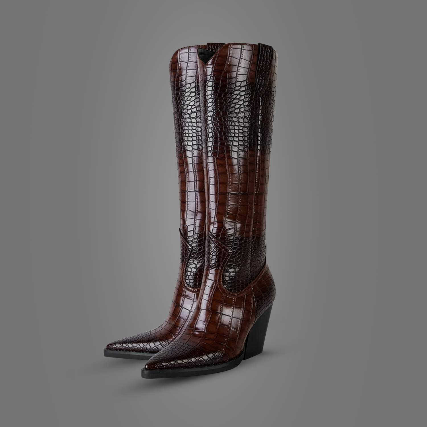 Sculpted in croc-embossed genuine leather, the Westline Boot strikes the perfect balance between Western edge and modern sophistication. Its sleek pointed toe and angled block heel elongate the leg with effortless poise, while the knee-high, slip-on silhouette delivers a smooth, second-skin fit made to move seamlessly from day to night.