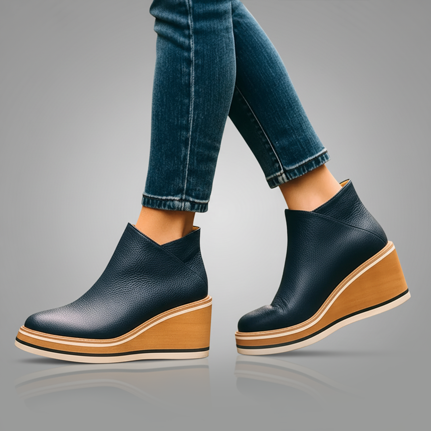 Crafted from smooth premium leather, the Milano Wedge Boots offer elevated comfort with orthopedic cushioning and a shock-absorbing platform sole. The inner side-zip makes them easy to slip on, while the clean, structured silhouette pairs effortlessly with any outfit.